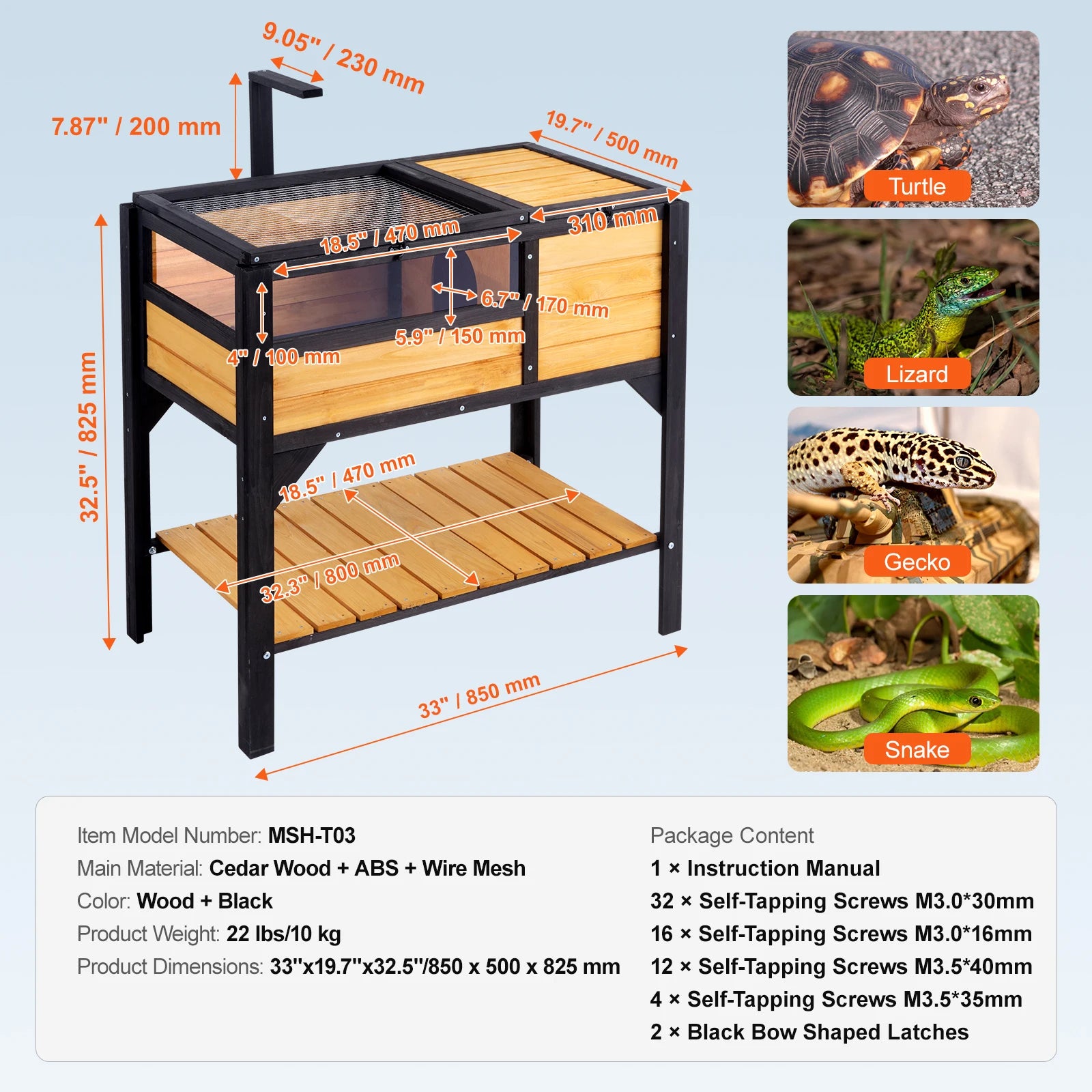 The spacious design accommodates different species of small reptiles. The secure, lockable mesh top cover helps prevent escapes, making it perfect for tortoises, geckos, snakes, lizards, and other small pets.