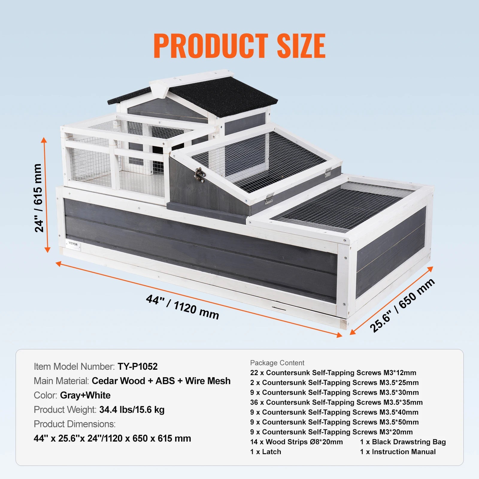 Dimensions: 1120 x 650 x 615 mm (44"" x 25.6"" x 24""), Weight: 15.6 kg (34.4 lbs), Main Material: Cedar Wood, ABS, Wire Mesh, Color: Gray + White, Model Number: TY-P1052