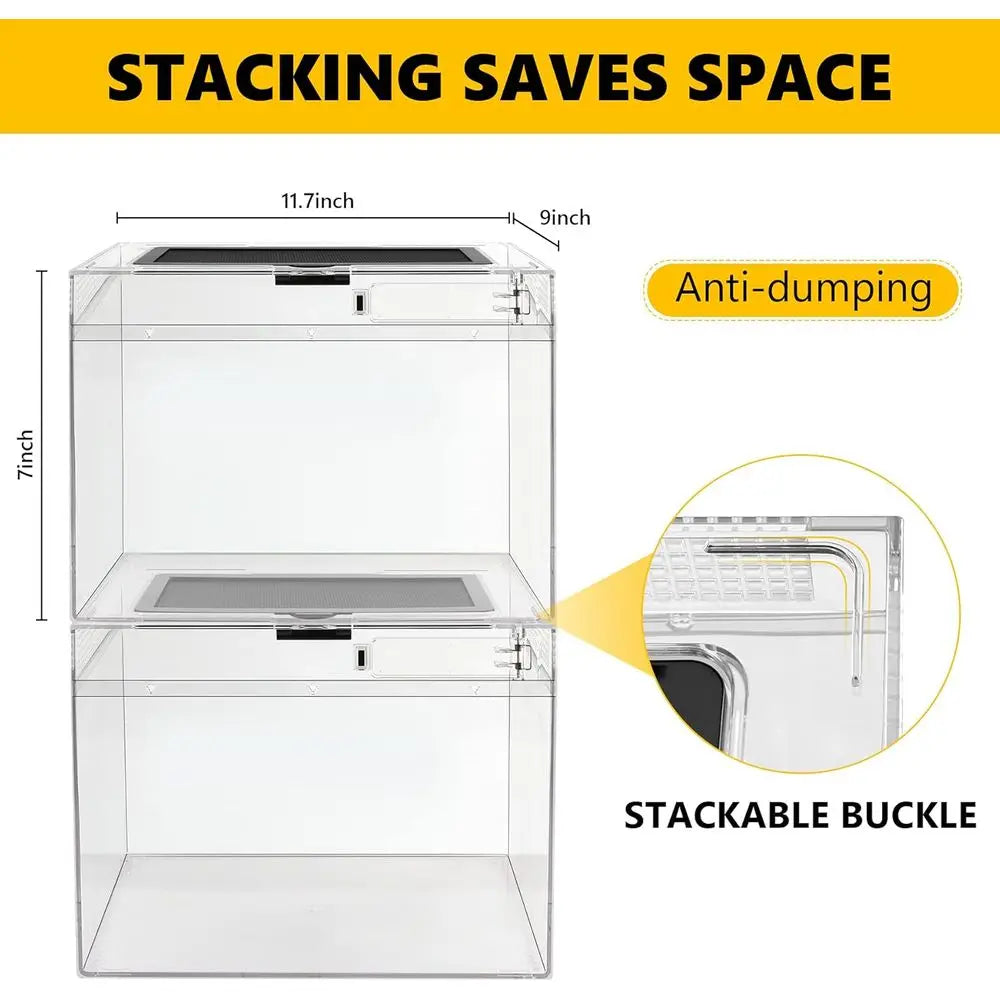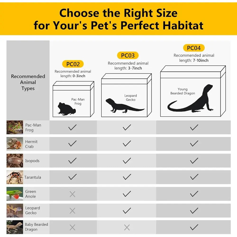This terrarium is crafted from durable polyvinyl chloride (PVC), offering a shatter-resistant and transparent design for easy observation of your pets. With a tank volume of 8.5 gallons, it features a rectangular shape and dimensions of 10.5 in length, 9.4 in width, and 19.5 in height, weighing 6.1 pounds. The tank is lockable, rimless, stackable, and designed for both indoor and outdoor use, making it suitable for terrariums housing reptiles, amphibians, and invertebrates. It's ideal for hobbyists, educational purposes, and is equipped with a complete starter kit that includes the tank, stainless tweezers, digital hygrometer, hide cave, sprayer, feeding bowl, and lamp. The one-piece, no-assembly structure ensures ease of use, while the 360° view and ventilated top support a healthy environment for your pets. The waterproof base allows for both desert and rainforest setups, maintaining stable humidity and temperature for a variety of reptile and amphibian species. Its compact and stackable design is widely compatible with various settings, including homes, classrooms, reptile rooms, breeding racks, and pet stores, making it perfect for geckos, frogs, and hermit crabs.